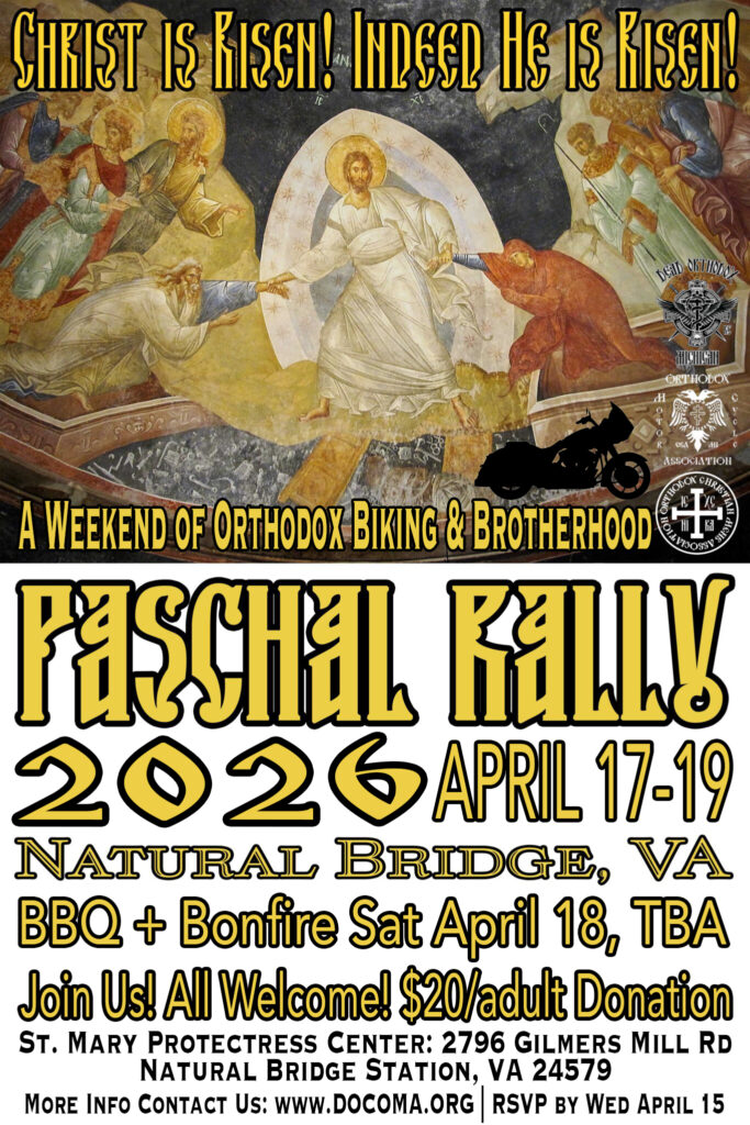 Orthodox Motorcycle Association (OMA) is the second level of brotherhood (apprentice, probate), focusing on “illumination/noetic vision” (theoria) , i.e., participating in the liturgical and sacramental life of the Orthodox Church, offering unmercenary service and security, feeding the hungry, visiting the sick and those in prison, and seeing Christ in the Scripture and all of creation (logoi of the Logos). You have to be Orthodox and have a motorcycle to join. In biker lingo we learn IMMBK (I aM My Brother’s Keeper). St. George is our patron saint: O Saint George pray to God for us!